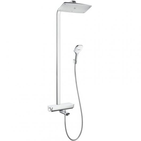 Showerpipe Hansgrohe Raindance Select E 360 cu baterie cada Ecostat Select, finisaj alb/crom